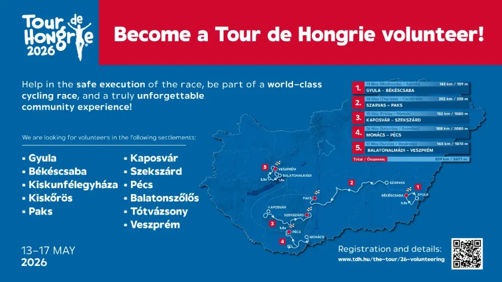 Tour de Hongrie cannot take place without the contribution of volunteers. To ensure a successful and safe event, the volunteer program is an essential element of the organization. It provides a high-quality experience for thousands of fans on-site, millions of TV viewers, and world-class athletes.