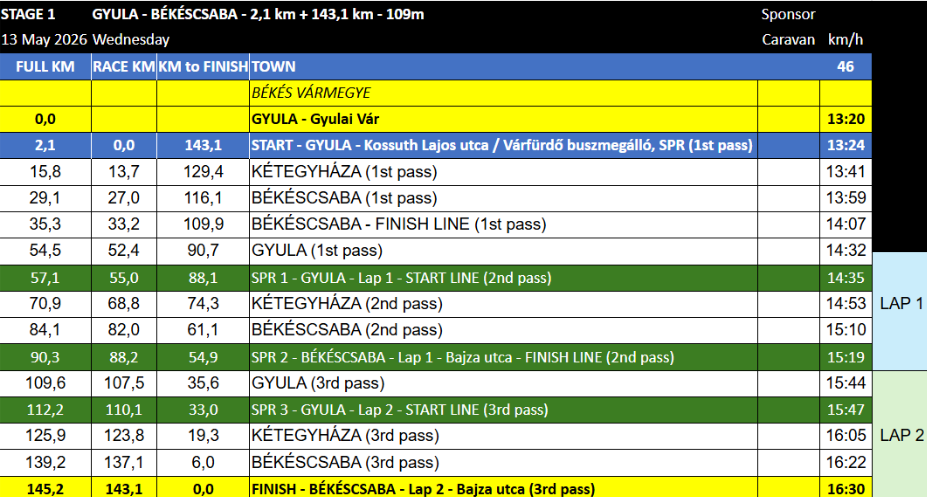 Tour de Hongrie 2026 will start from Békés County for the first time since 2005. From Gyula, the caravan will head towards Kétegyháza and then Békéscsaba, before returning to the start location from Doboz. The peloton will finish in Békéscsaba after 2.5 laps. The 143-kilometer, completely flat stage could be made chaotic by the wind, but it is likely that the sprinters will battle it out for the first yellow jersey of TdH.