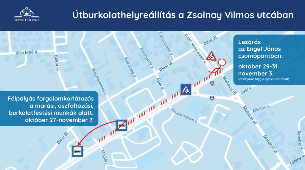 A munkálatok alatt, október 27-től várhatóan november 7-ig a Zsolnay Vilmos utca belváros felé haladó szélső sávját lezárják a Magtár utca és Engel János utca között. A közlekedés egy forgalmi sávon folyamatosan biztosított lesz. A Mohácsi út belváros irányú buszmegállót ideiglenesen a Shell benzinkút előtti járdára helyezik át.