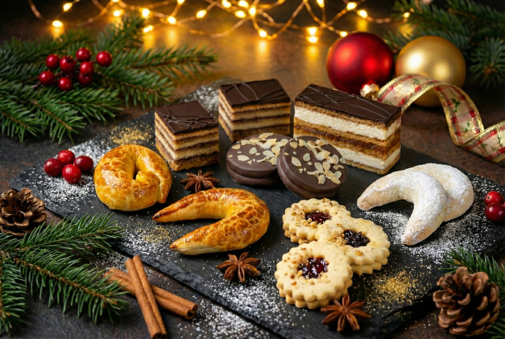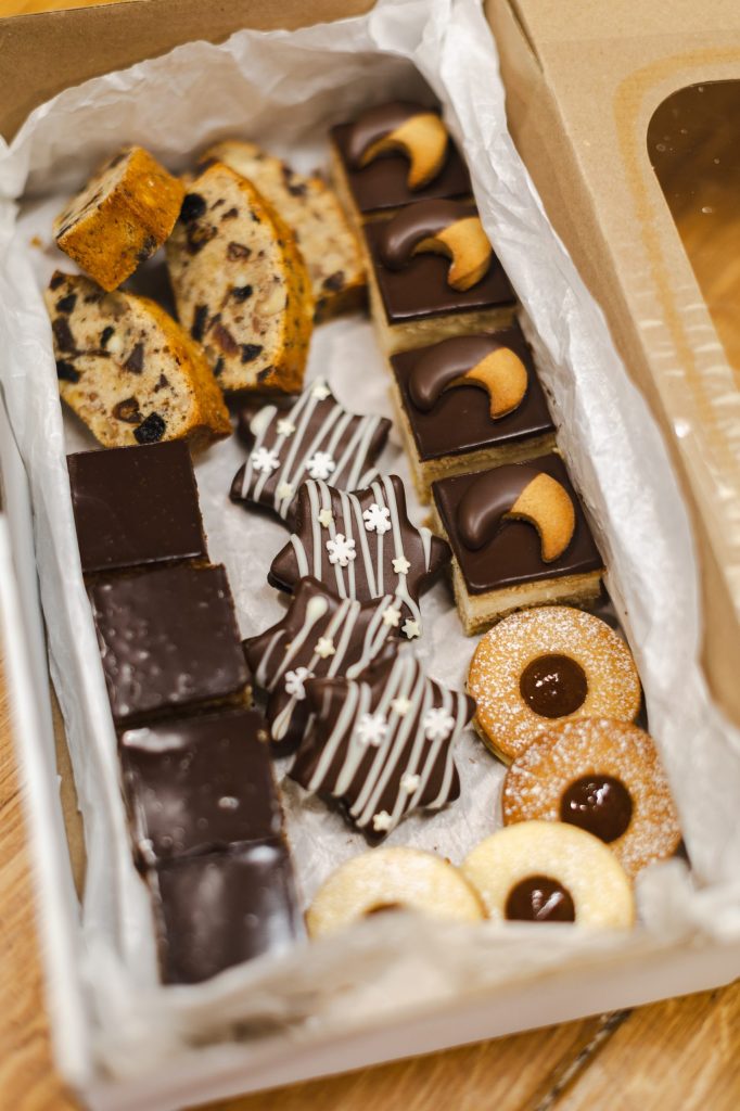 - Karácsonyi sütemény válogatás – Zserbó, Mézeskrémes, karácsonyi isler, linzerkarika, püspökkenyér díszdobozban