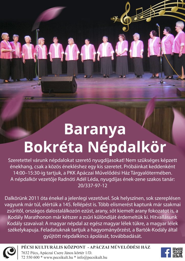 Nevükhöz híven először csak baranyai népdalokat énekeltünk, később választottunk más megyék szép dalai közül is. Összesen 28 népdalcsokrunk van, ha valamelyik helyszínen már többször szerepelünk, soha nem énekeljük ugyanazt.