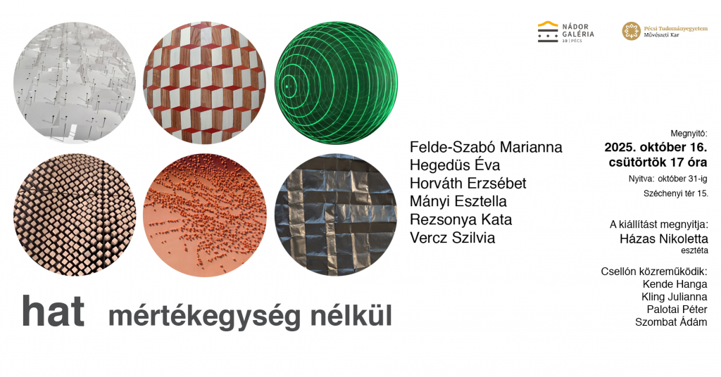 A HAT mértékegység nélkül cím utal egyben a hat kiállító művészre, – Felde-Szabó Marianna, Hegedüs Éva, Horváth Erzsébet, Mányi Esztella, Rezsonya Katalin, Vercz Szilvia – és az erre a hívószóra készülő új alkotásokra is.