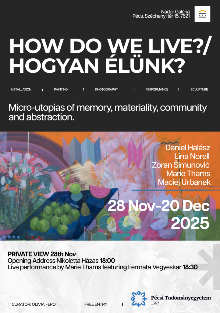 A „Hogyan élünk?” című kiállítás változatos alkotói gyakorlatokon keresztül tárja fel az emlékezet, az anyagiság és az absztrakció közötti kölcsönhatásokat. A kiállított műalkotások arra hívják a nézőt, elmélkedjen el azon, hogy a töredékek – legyenek akár anyagi, fogalmi, akár érzékelési töredékek – miként alakítják azt, ahogyan a világot értjük, hogyan keltenek életre szélesebb narratívákat, hidat képezve a személyes és az egyetemes között. A kiállítás megtekinthető december 20-ig, hétfőtől péntekig 14-től 18 óráig.