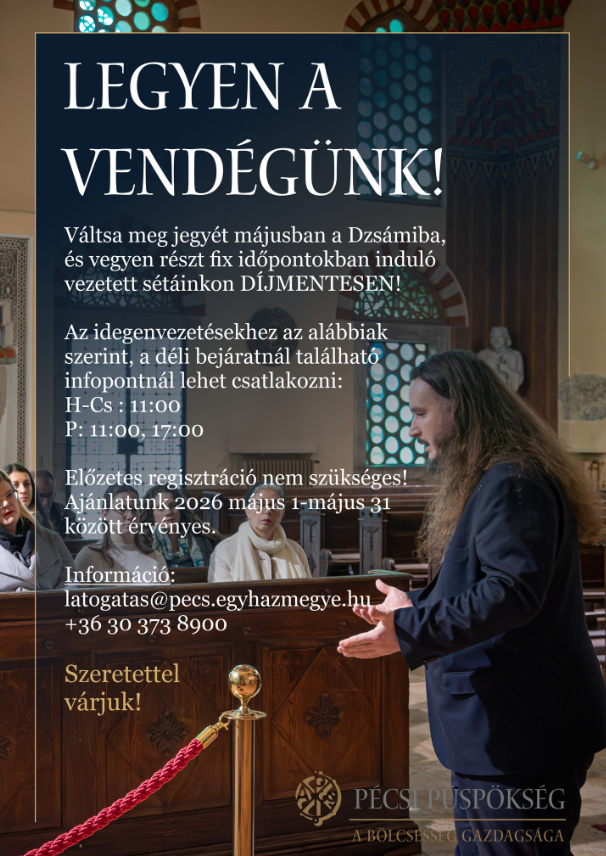 Amennyiben 2026. május 1. és május 31. között váltja meg belépőjegyét a Dzsámiba, rendkívüli kedvezményként díjmentesen vehet részt fix időpontokban induló vezetett sétáinkon.