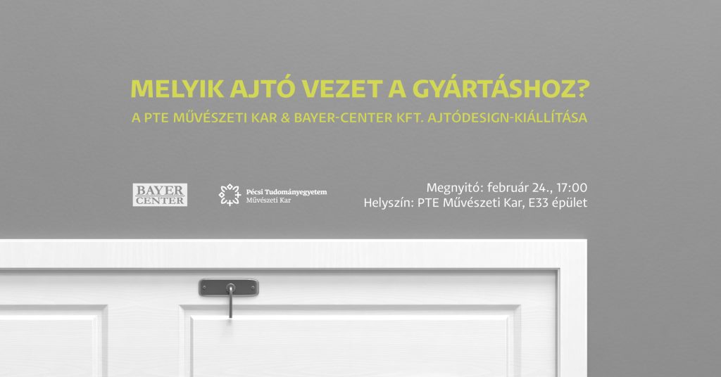 Damokos Csaba designer, látványtervező doktorandusz hallgatónk vezetésével festő, szobrász, keramikus, grafikus és üveg szakos hallgatóink megtapasztalhatták, milyen, amikor a technológia úgy szab határokat, hogy közben új lehetőségeket is teremt. A PTE Művészeti Kar hallgatói az előző félévben ajtódesign-terveket készítettek a Bayer-Center Kft. felkérésére: kurzus során született, több, mint 40 tervből kiválasztott (a cég mintabemutató termébe szánt) 13 látványterv most először látható egy kiállítás keretében.