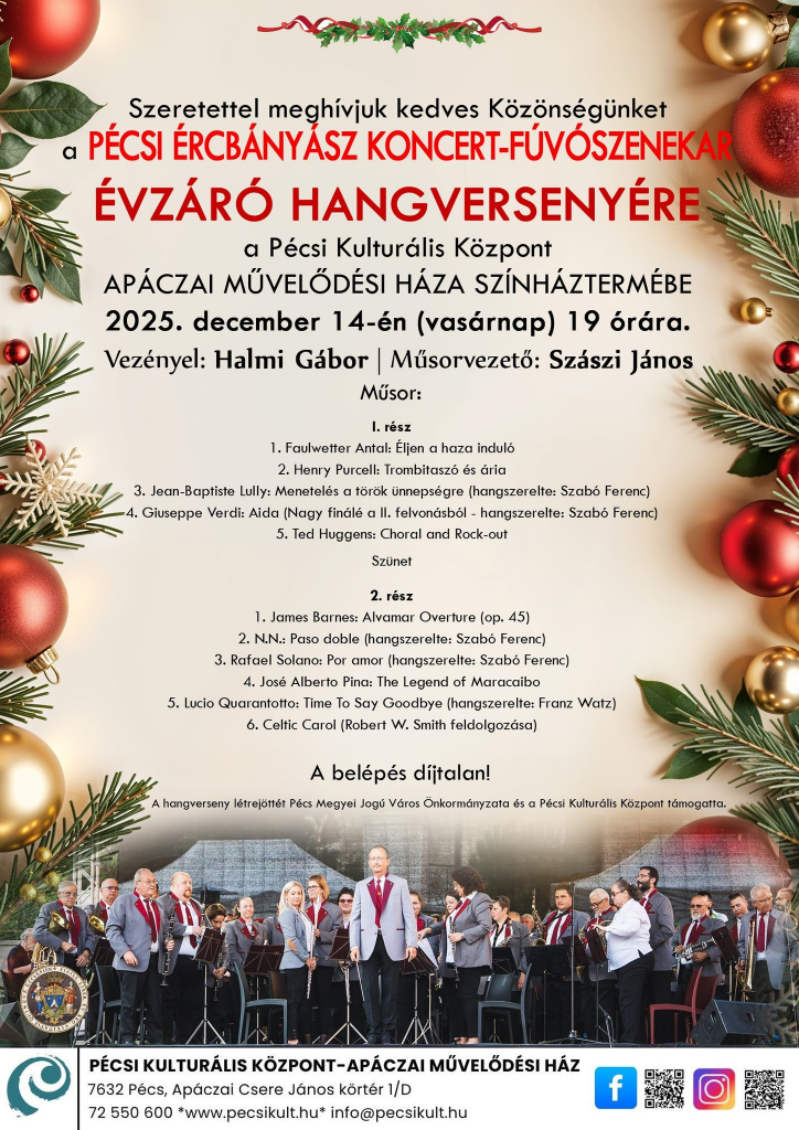 Kezdőlap / Programok / Pécsi Ércbányász Koncert-fúvószenekar Évzáró Hangversenye Pécsi Ércbányász Koncert-fúvószenekar Évzáró Hangversenye Dátum dec. 14. Időpont 19:00 Helyszín Művészeti Iskola - Apáczai Nevelési és Általános Művelődési Központ Részvétel Ingyenes Naptárba mentem Útvonaltervezés Hivatalos oldal Zene A belépés ingyenes! A helyek foglalása érkezási sorrendben történik. Programajánló dec. 08. Programsorozat Városnézés Pécs udvarainak rejtett kincsei | Apáca utca máj. 04. – dec. 28. Cella Septichora Látogatóközpont dec. 12. Programsorozat Városnézés +1 Világörökségi séta jún. 20. – dec. 28. változó napokon Cella Septichora Látogatóközpont dec. 13. Programsorozat Városnézés Föld alatti Pécs - séta a város alatt jún. 21. – dec. 27. változó napokon Cella Septichora Látogatóközpont További programok