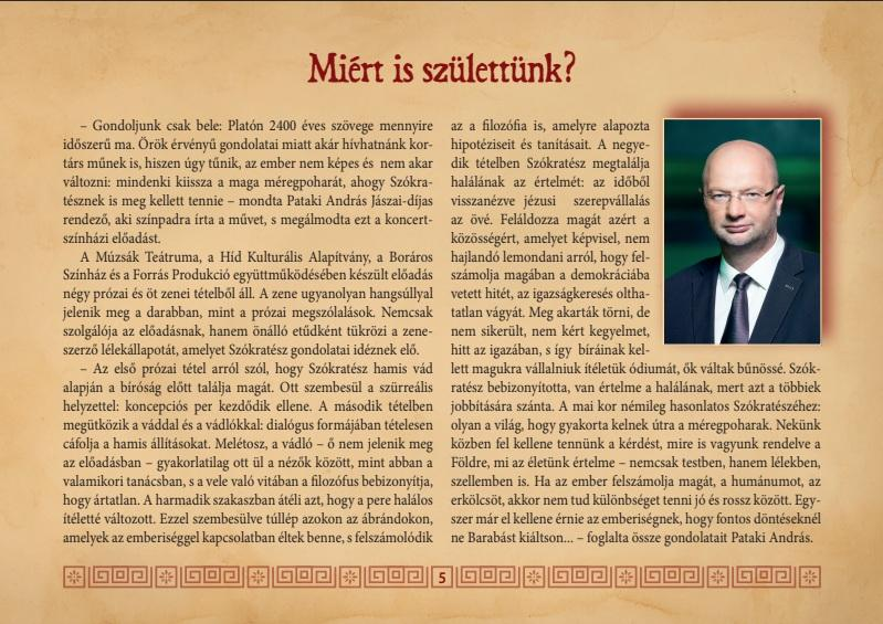 A híres görög filozófus az antik görög filozófiát meghatározó nagy triász második tagja, Szókratész tanítványa, Arisztotelész mestere. Platón Szókratész életére és gondolataira építve olyan filozófiai rendszert dolgozott ki, mely mögött etikai kérdések húzódnak meg. Kr.e. 399-ben, amikor az athéni demokrácia Szókratészt halálra ítélte, Platón Szókratész tanítványaival és Eukleidésszel együtt Megarába ment, és a következő néhány év során sokat utazott, Görögországban, Egyiptomban és Itáliában. A fiatal Platónra Szókratész alakja volt a legnagyobb és legmaradandóbb hatással. A Szókratész védőbeszéde című műve valószínűleg Kr. e. a 380-as évek elején született. Az előadó Boráros Imre szellemi rokonságot érez Szókratész a kultúráért a humánumért akár önmagát is feláldozni is képes világlátásával. Az előadásban Szókratész vádlói testetlen alakok, árnyékok, akik mint a valóságban is – rontásunkra törnek.