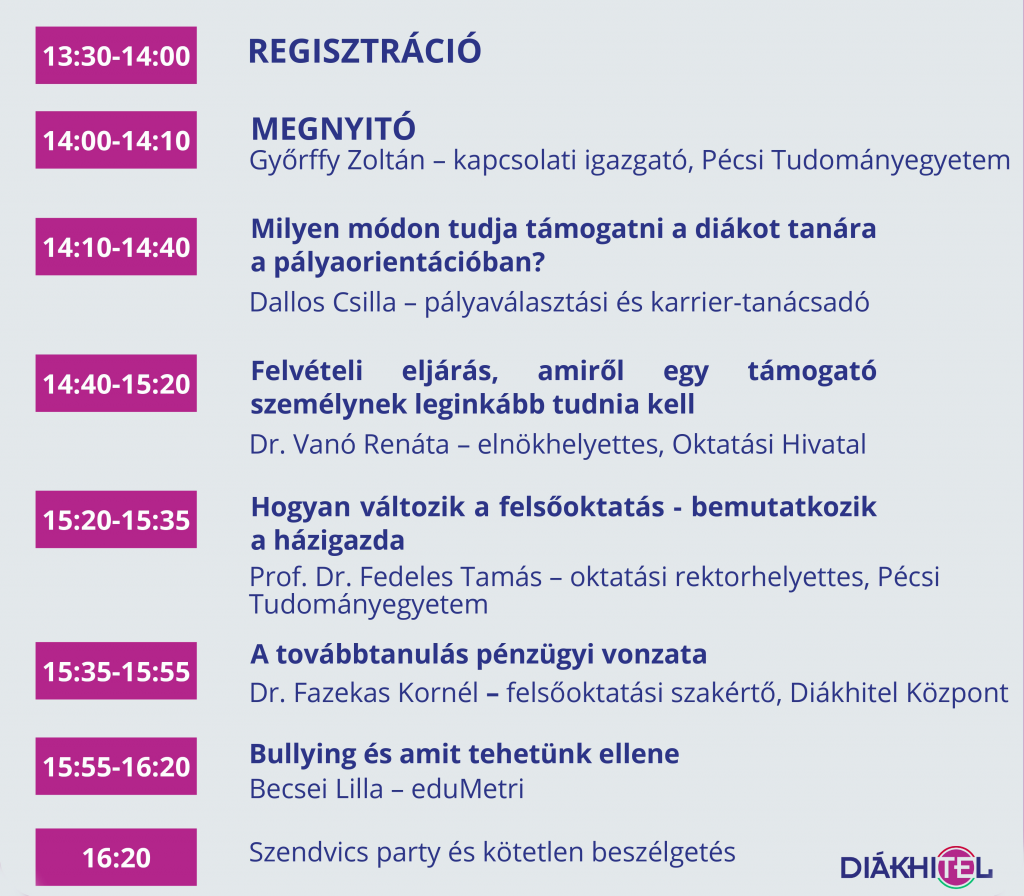 Az esemény alkalmat kínál arra, hogy átfogó képet adjon a jelenlegi felvételi szabályozásról, a felsőoktatási rendszer átalakulásáról, hiteles támpontokat adjon a diákok pályaorientációjának segítéséhez, megismertesse a továbbtanulás pénzügyi hátterét, valamint, hogy a szakemberek és pedagógusok megosszák egymással tapasztalataikat egy kötetlen beszélgetés keretében.